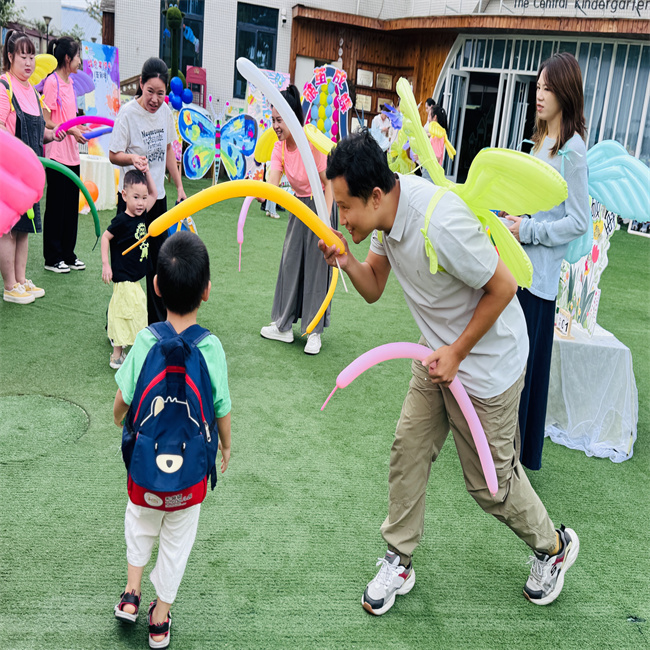 刚踏入幼儿园大门,孩子们就被一个个奇妙的关卡包围啦!家长代表们似蝴蝶精灵用长条气球挡住去路,和宝们化身毛毛虫突破重围,往前冲去。